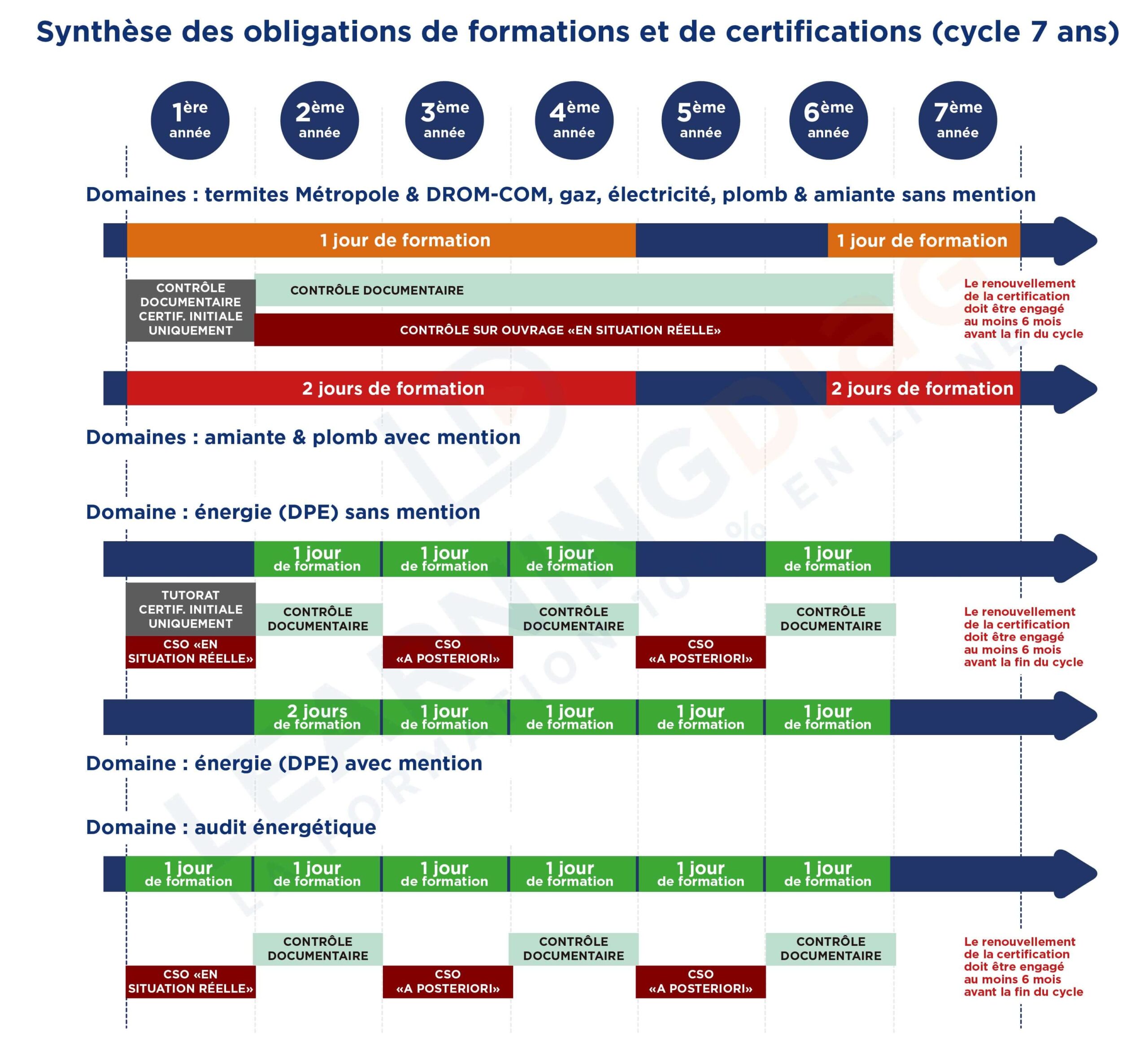 Synthèse des obligations de formations et de certifications (cycle 7 ans) :